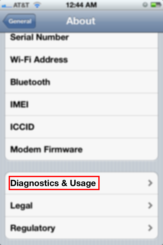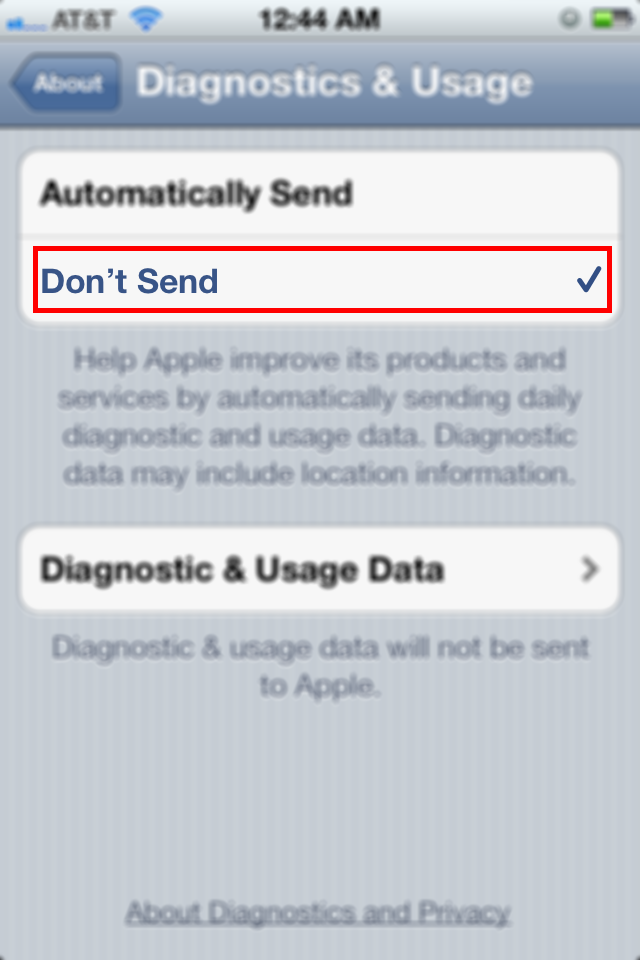 Tap on “Settings” -> “General” -> “About” -> “Diagnostic & Usage” -> “Don’t Send” (see screenshots below). Carrier IQ checks this settings when your iPhone boots. Thus, it would be a good idea to reboot your phone at this point: hold the power and “Home” button simultaneously for several seconds, until the screen goes black and the the Apple logo appears. Wait for the phone to finish booting and double-check the “Diagnostic & Usage” setting to make sure it is still set to “Don’t Send”.