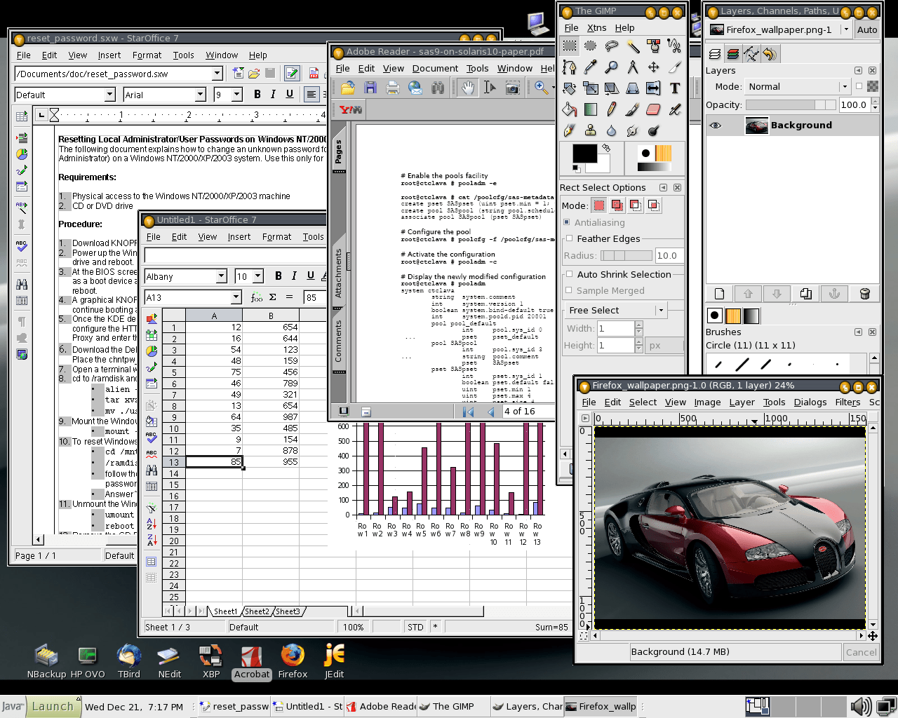 Another screenshot with some office productivity applications: StarOffice 7 word processor and spreadhseet application; Adobe Acrobat Reader; GIMP image editing application.