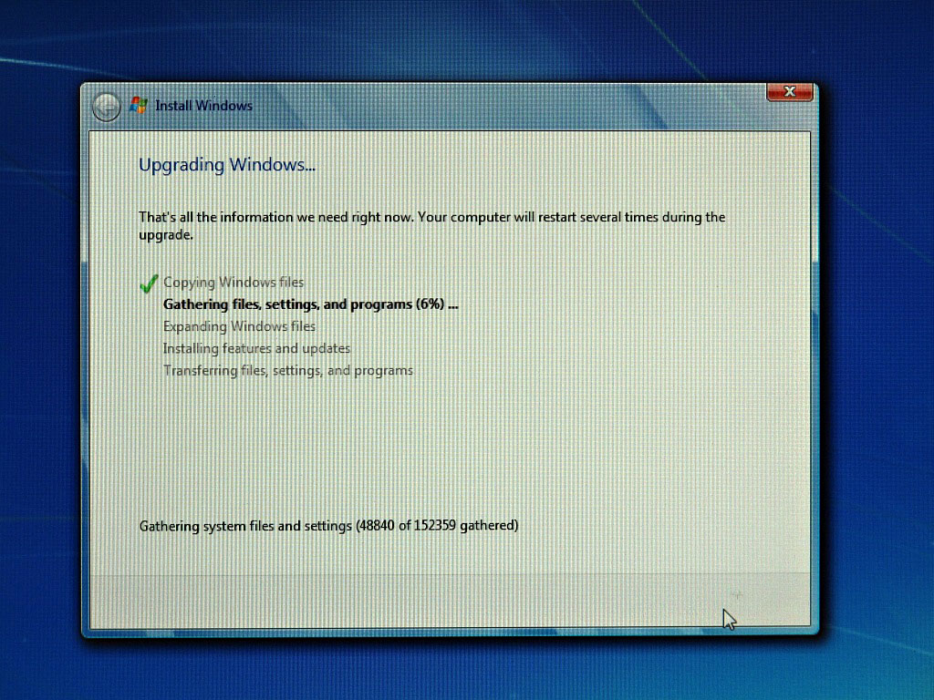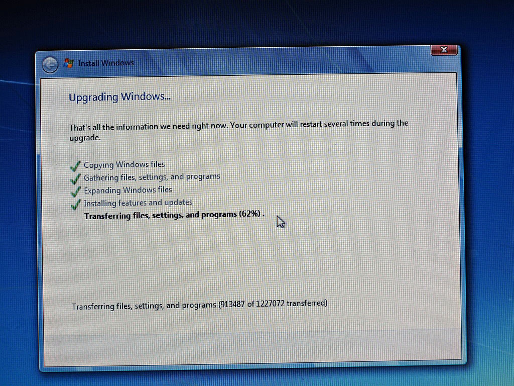 Once initiated, the upgrade process tells you the following: “That’s all the information we need right now. Your computer will restart several times during the upgrade.” This seemed to imply that the rest of the upgrade process is automated and does not require user interaction. As it turned out, however, this was not the case. The upgrade process goes through five phases: